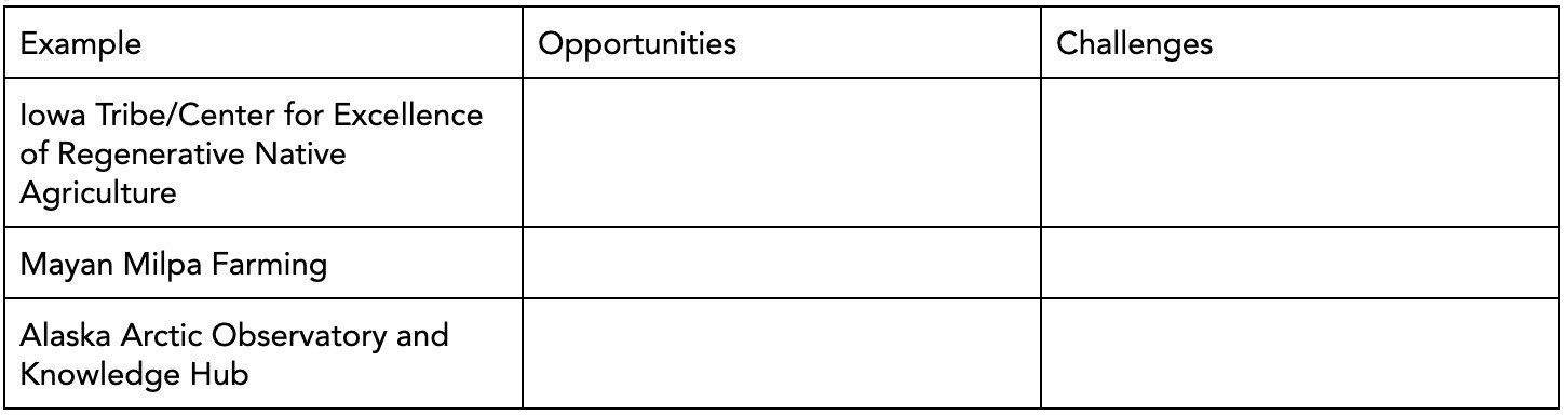 - Identify some of the opportunities and challenges in using TEK to address environmental challenges.